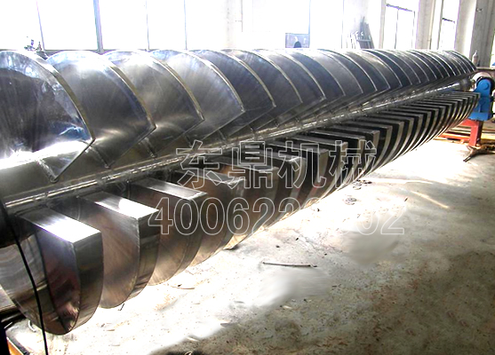 槳葉烘干機工作原理:空心軸上密集排列著楔型中空漿葉,熱介質經空心軸流經漿葉。單位有效容積內傳熱面積很大,熱介質溫度從-40℃到320℃,可以是水蒸汽,也可以是液體 型:如熱水、導熱油等。間接傳導加熱,沒有攜帶空氣帶走熱量,熱量均用來加熱物料。熱量損失僅為通過器體保溫層向環境的散熱。楔型漿葉傳熱面具有自清潔功 能。物料顆粒與楔型面的相對運動產生洗刷作用,能夠洗刷掉楔型面上附著物料,使運轉中一直保持著清潔的傳熱面。漿葉干燥機的殼體為Ω型,殼體內一般安排二 到四根空心攪拌軸。殼體有密封端蓋與上蓋,防止物料粉塵外泄而充分發揮作用。傳熱介質通過旋轉接頭,流經殼體夾套及空心攪拌軸,空心攪拌軸依據熱介質的類型而具有不同的內部結構,以保證傳熱效果。