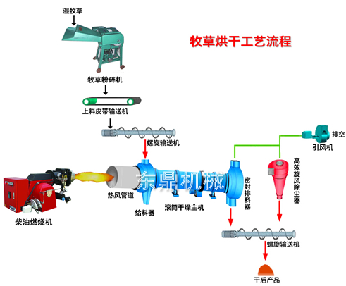 經粉碎切段處理的濕牧草推入上料刮板運輸機,在運送過程中夾雜的 鐵器將被永久磁鐵吸出。在刮板運輸機出料口前均料機將苜蓿料層推平,等厚度的料流進入上料機螺旋輸送機,再將料排人熱風爐出風口處,教高溫熱氣流吸人干燥 烘干機內進行烘干。烘干后的物料吸A排料系統,混入的石塊等雜物沉積到沉積裝置(定期排出),干物料在收集器(A)進行料風分離,干物料經閉風出料機排出 進入打包機打包,從收集器排出的熱風(100℃以上)經循環風機少數排人大氣,大都返回熱風爐進行再加熱,作為再次烘干的熱載體。從冷卻系統排出的低溫風 排人大氣。