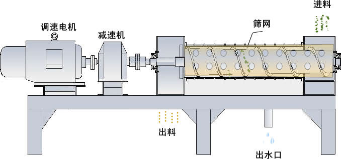 螺旋擠壓脫水機(jī)主要由進(jìn)料箱、軸承座、錐型螺旋、濾水架、濾水籠、機(jī)座、聯(lián)軸器、電機(jī)、減速機(jī)及變速箱等零部件構(gòu)成。其工藝原理如下:需脫水的物料以曲篩 或離心篩預(yù)脫水后,從進(jìn)料口進(jìn)入擠壓機(jī)(對于含水份小于85%的物料可以直接進(jìn)擠壓機(jī))。物料被錐型螺旋擠壓脫水后,送至出料口,其大部分的水份從篩板濾 出。從而達(dá)到脫水的目的。脫水后的物料可直接進(jìn)干燥機(jī)進(jìn)行干燥。對于物料品種的不同和產(chǎn)量的變化可通過調(diào)整擠壓機(jī)轉(zhuǎn)速實(shí)現(xiàn),達(dá)到脫水效果和產(chǎn)量的好搭檔 合。調(diào)速電動(dòng)機(jī)運(yùn)轉(zhuǎn)正常后,物料從進(jìn)料箱均勻加入,進(jìn)機(jī)后的物料在螺旋旋轉(zhuǎn)葉片推動(dòng)下沿軸向前進(jìn),前進(jìn)過程中物料受變化的螺距和調(diào)節(jié)檔板的作用,形成巨大 的擠壓力,使物料在外力作用下進(jìn)行機(jī)械脫水,水份通過篩網(wǎng)在出水口處排出,脫水后的物料在出料箱處排出。